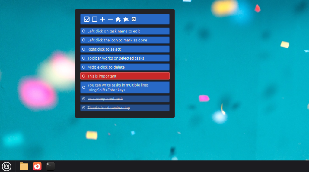 You can use this desklet for daily tasks, quick reminders, and small goals you do not want to forget. I also do not want a complex TODO app with lots of features or distractions. I just want a simple and clean list. It includes basic features like adding entries, marking items as done (which strikes through and fades them out), reordering items, setting priority colors, and adjusting the width of the list.