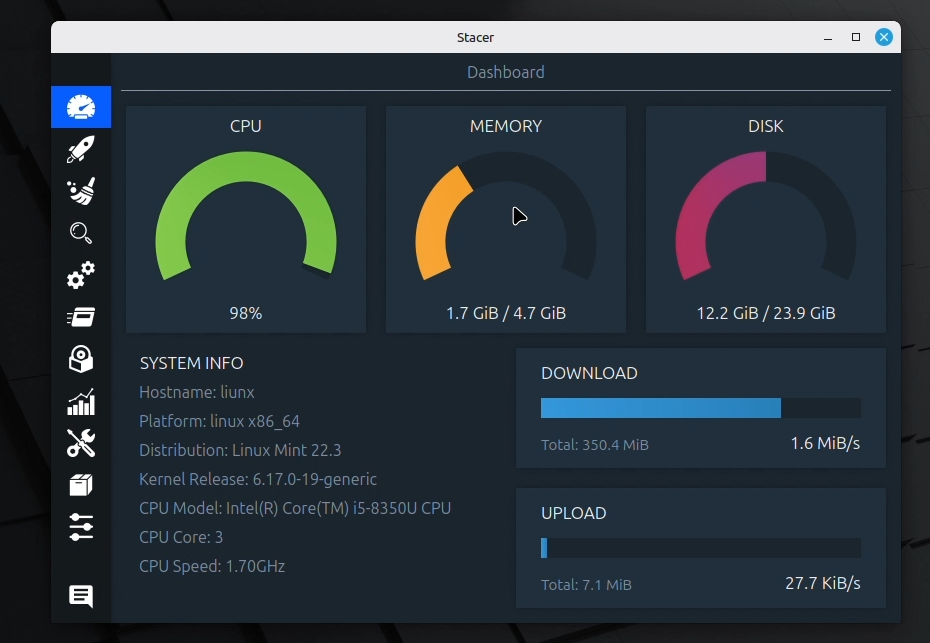 Linux Mint is already known for being fast and efficient, but Stacer adds an extra layer of control by giving you a clear, visual view of what is happening inside your system. Instead of relying entirely on terminal commands, Stacer presents important system information through a modern dashboard that is easy to understand at a glance.